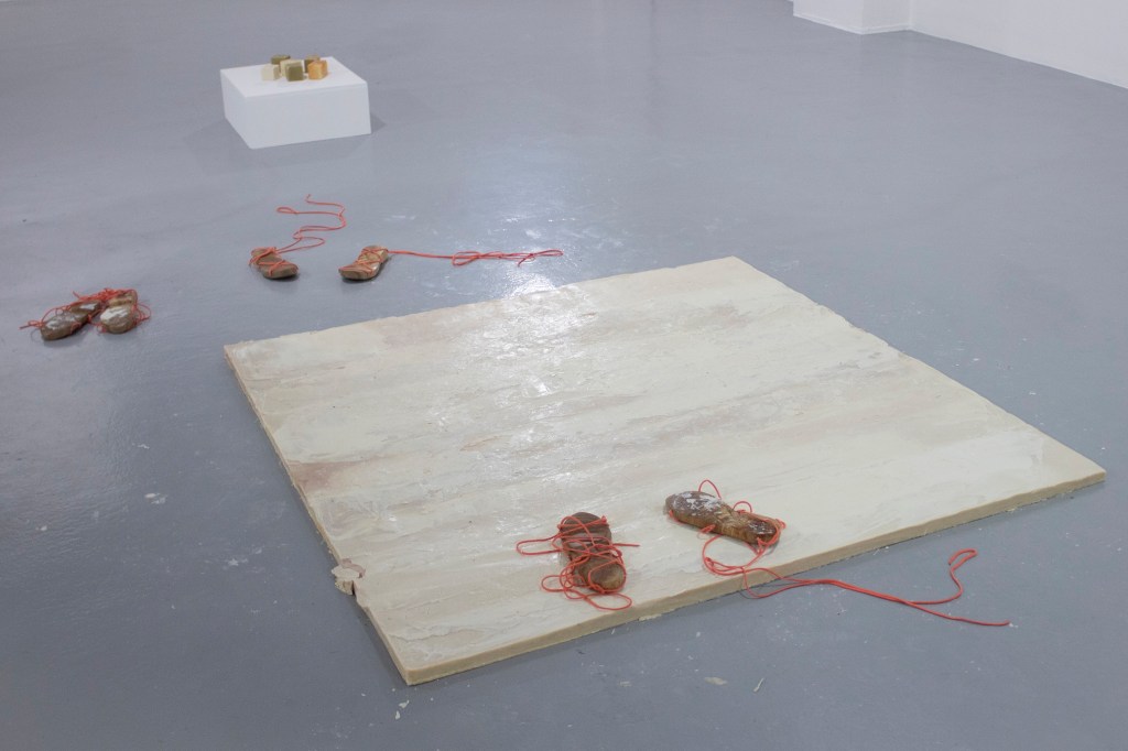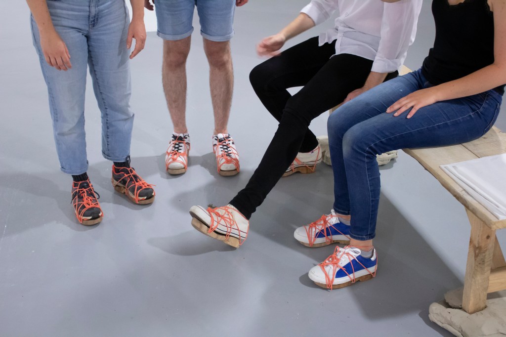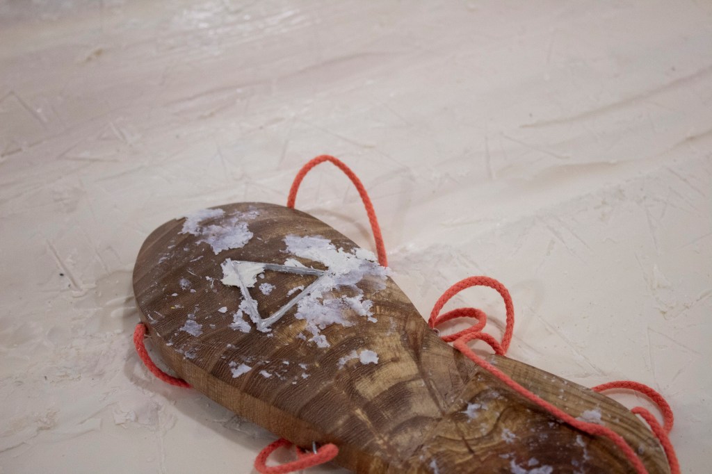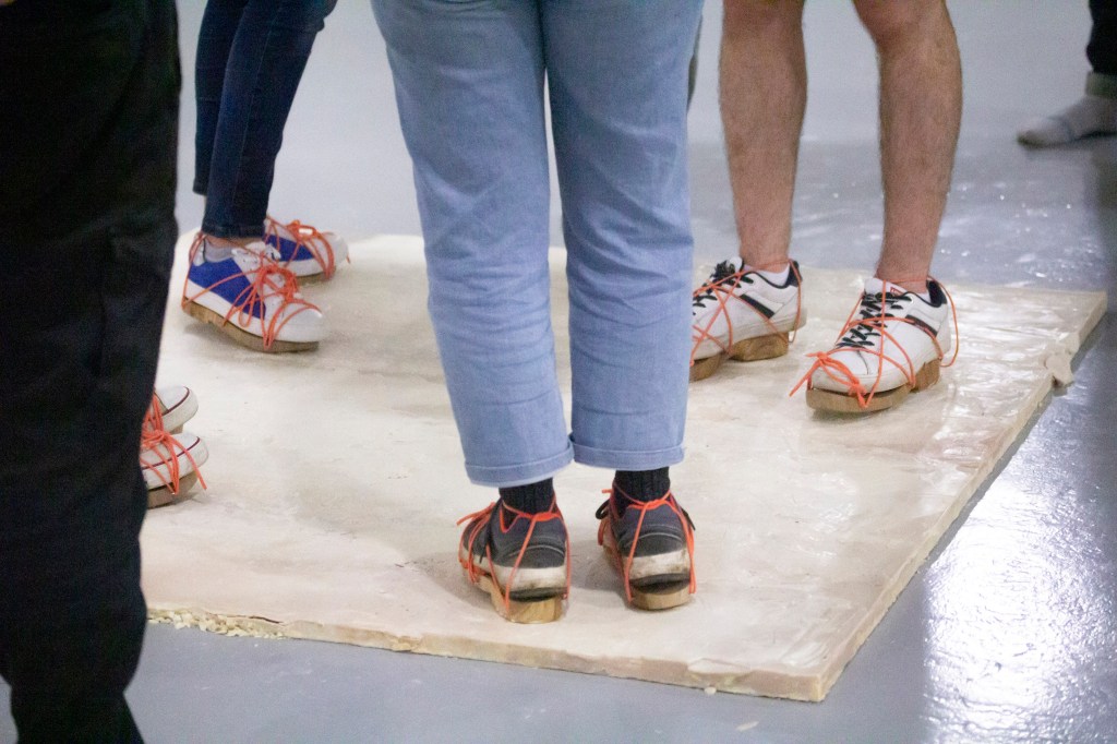 Les gavottes, plins, et autres kost ar c’hoat sont des danses bretonnes qui rassemblent le temps de quelques morceaux voisins et voisines, ami.e.s et inconnu.e.s de passage. Lors des fest al leur nevez, fêtes de l’aire neuve, en déclin dès la fin du XIXe, ces danses servaient à piétiner un mélange de glaise et d’eau jusqu’à le transformer en un sol dit de terre-battue, qui recouvrait la surface des maisons et des granges. Le passage répété des danseurs créait une dalle unie et homogène, sur laquelle il devenait possible de circuler et de vivre. Pour Lusk, l’idée du piétinement est reprise, mais il s’agit cette fois de danser sur du savon frais, afin de l’imprimer d’un passage : les semelles en bois, portées par les danseurs et danseuses, marquent le sol mou d’un triangle unique, indicateur de la composition du savon.
