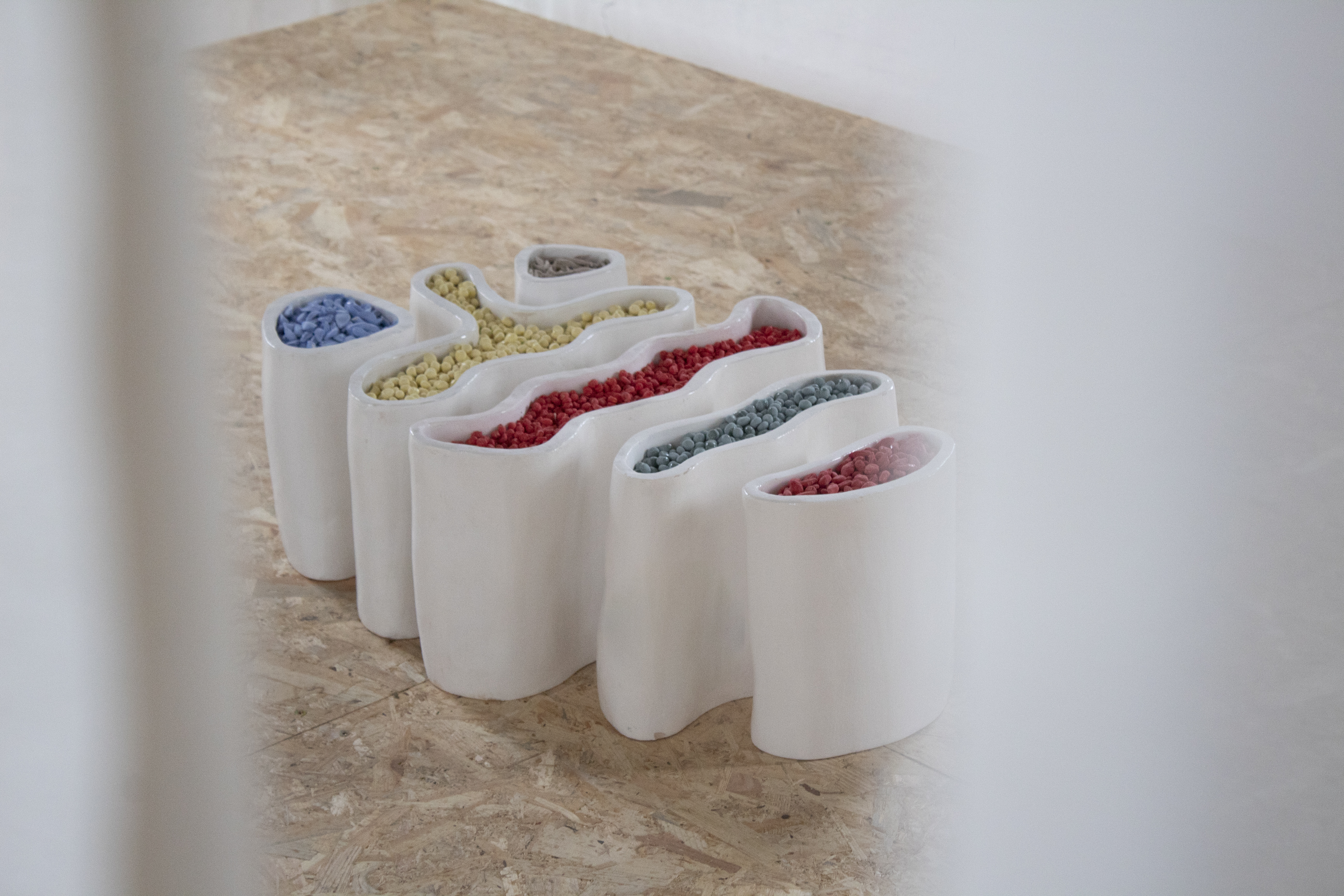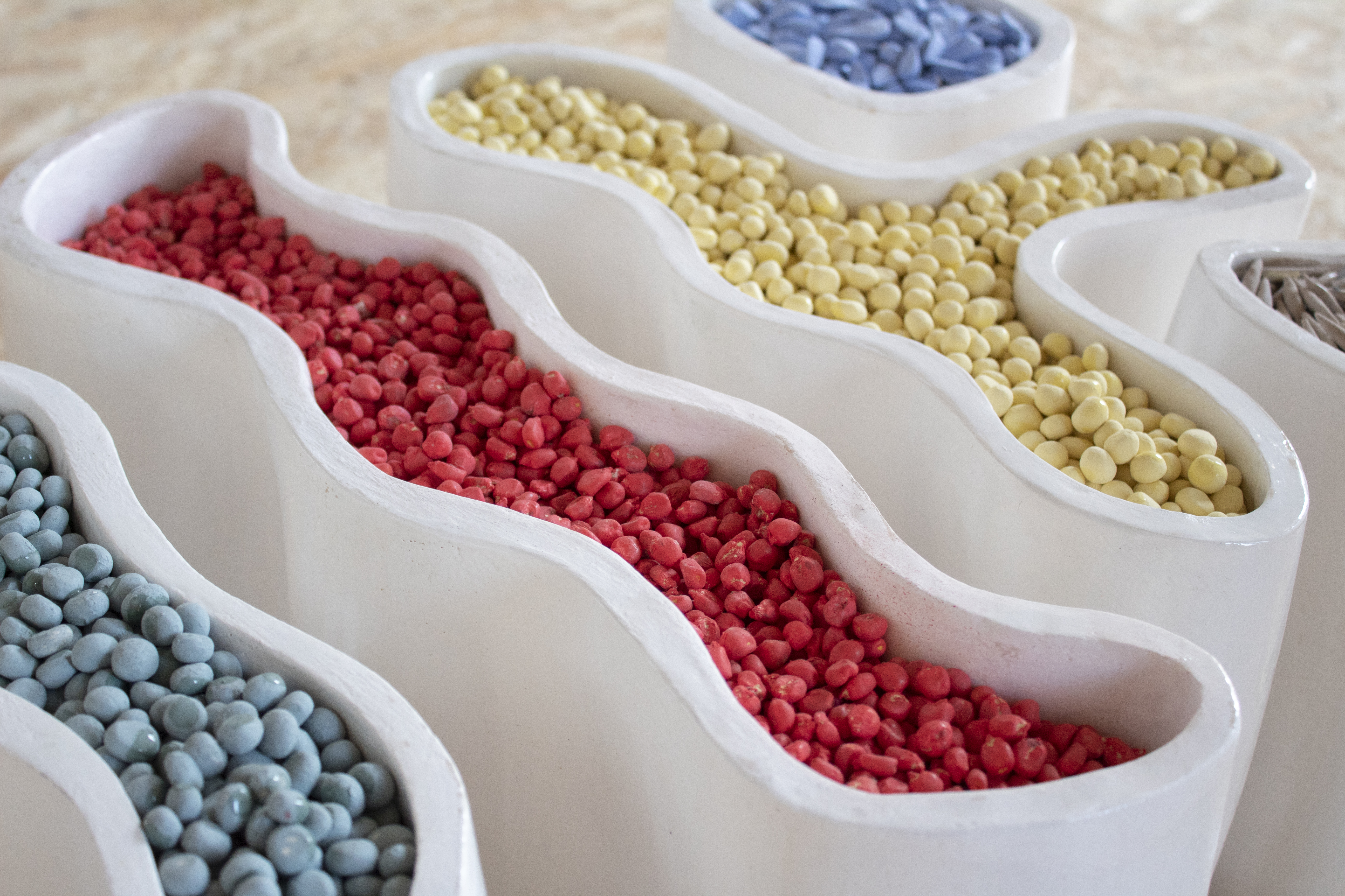 Le secteur de l’agriculture est régulièrement pointé du doigt pour son impact sur le paysage et sur le vivant et les études scientifiques alarmantes, qui appellent à changer les modes de production pour préserver nos conditions de vie sur Terre, renforcent le décalage avec les pratiques quotidiennes des agriculteurs et des agricultrices. Marquée dans son enfance par ces graines de maïs rose vif, typique des traitements qui les protègent, Mathilde Vaillant propose ici une étude chromatique de ces semences enrobées qui varient en fonction des variétés et de la typologie des champs. Par cette approche plastique, elle donne à voir la réalité méconnue des cultures en agriculture conventionnelle qui s’appuient sur l’aide des produits phytosanitaires, et-ce malgré les dangers pour l’environnement et pour ses travailleur·euses. Témoin d’une situation où les agriculteurs risquent leur santé à chaque manipulation, elle choisi de montrer ces couleurs surprenantes et séduisantes qui devraient inspirer une toute autre réaction.