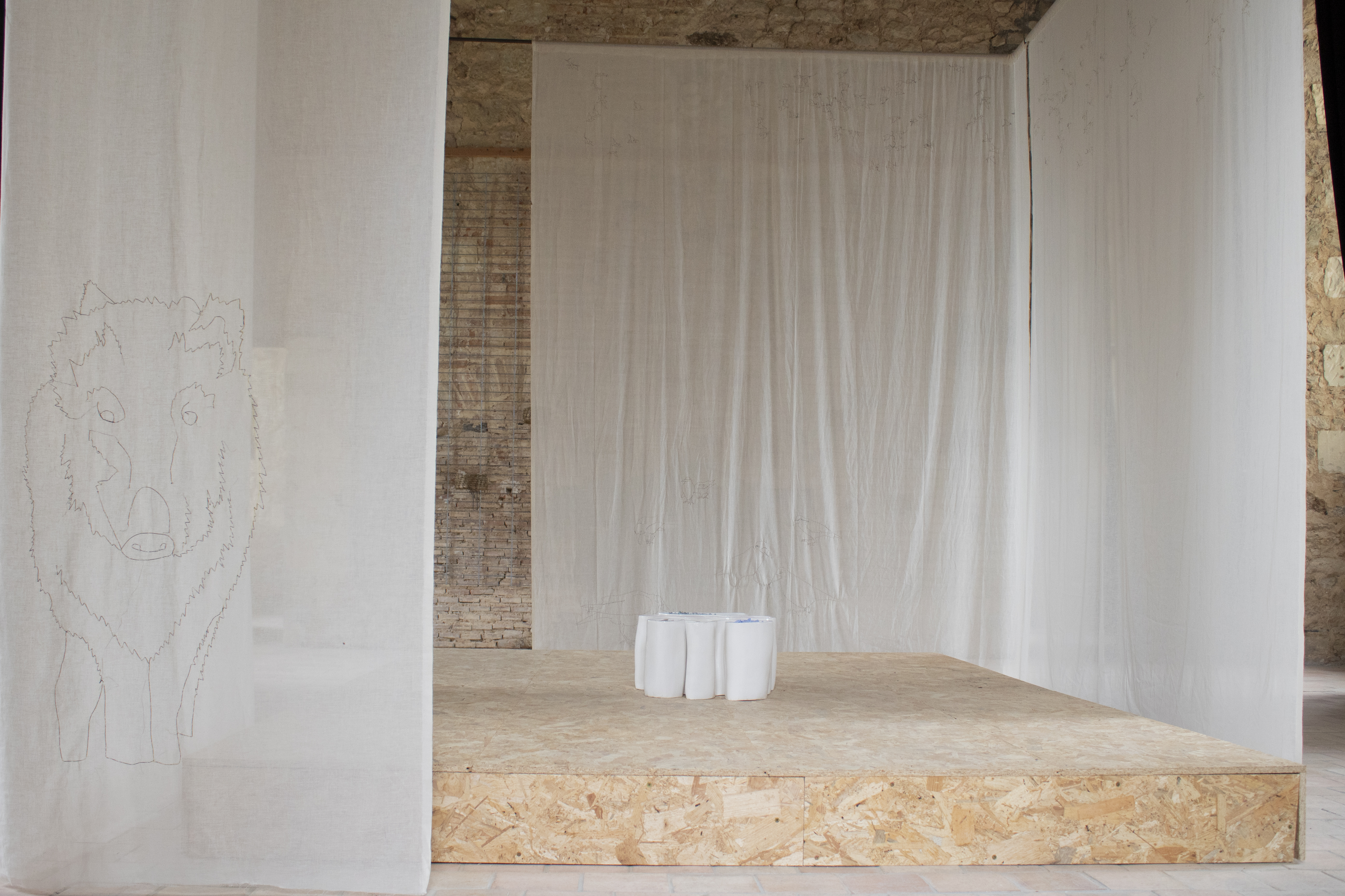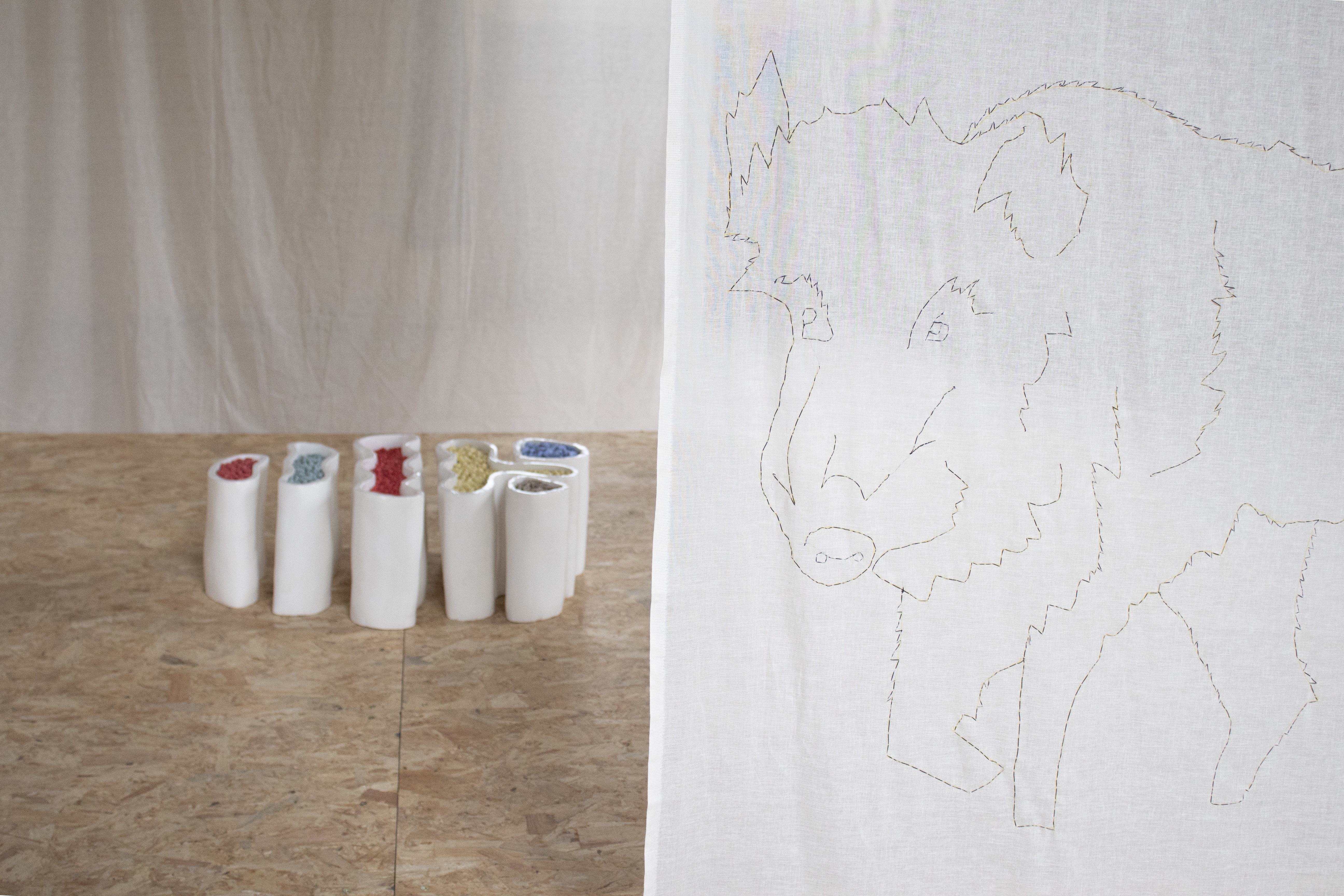 En parallèle de cette étude chromatique, une collection d’oeuvres fabriquées artisanalement, inspirés de pratiques ancestrales vernaculaires, vient nourrir une réflexion sur la dualité entre modernité et tradition. Contrastant avec l’efficacité des exploitations agricoles modernes et l’amélioration des rendements, ces objets désormais désuets, fastidieux à créer, renvoient à un modèle paysan devenu aujourd’hui une source d’inspiration pour des projets alternatifs mais aussi artistiques.