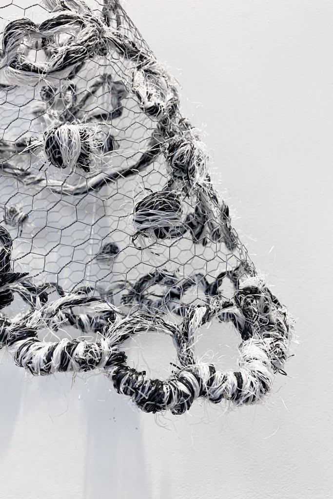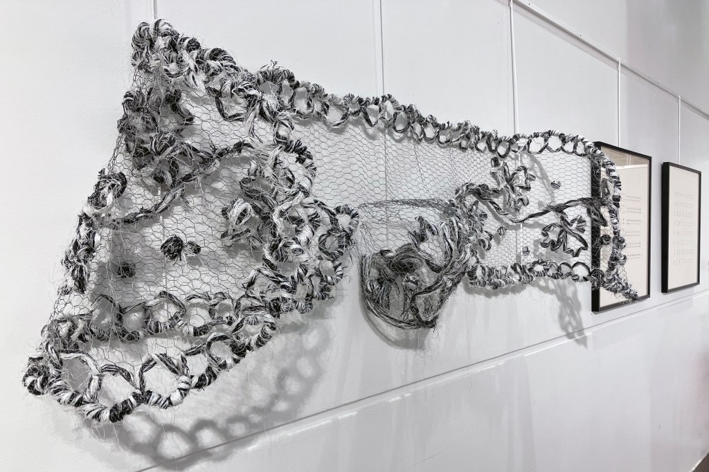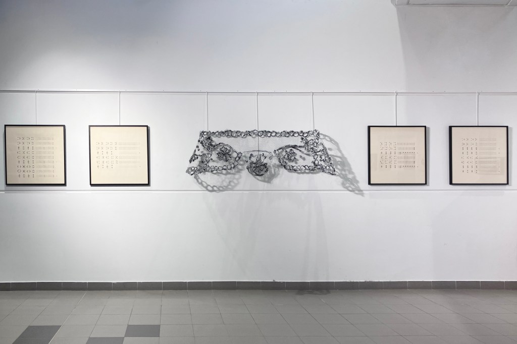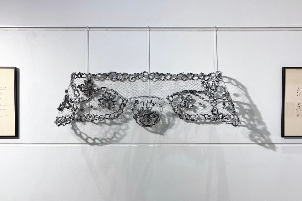 En complément de la série de photographies du club photo de Cesson qui met en avant les costumes traditionnels du pays de Rennes, l’œuvre Catiole permet de voir au plus près ce qui se trouve en si petit sur nos têtes. Reproduction fidèle d’un modèle des Perrières, cette coiffe géante est brodée en filets de plastique sur un grillage métallique, choisi pour sa structure similaire à celle du tulle de coton traditionnellement utilisé.