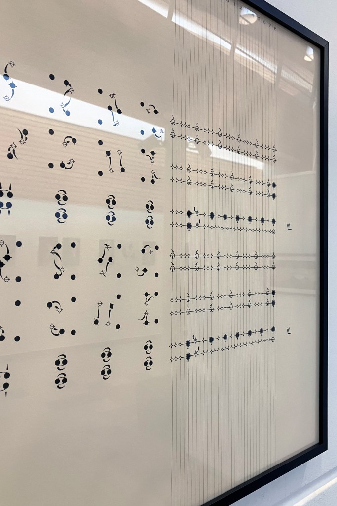 Dans une démarche d’apprentissage et de transmission de la danse, elle cherche à retranscrire les éléments essentiels, à l’image d’une partition de musique qui s’appuie sur une codification bien précise. Ici, elle invente des symboles, explore des façons de structurer la partition pour donner à la fois des informations sur ce qui fait la danse : les déplacements, les mouvements des pieds, les placements des bras, mais également pour mettre en lumière les différences entre chaque avant-deux, le tout motivé par une recherche esthétique.